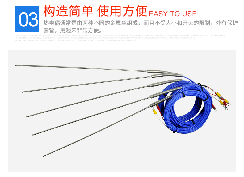 ③ 構造簡單,使用方便 熱電偶通常是由兩種不同的金屬絲組成,而且不受大小和開頭的限制,外有保護套管,用起來非常方便。